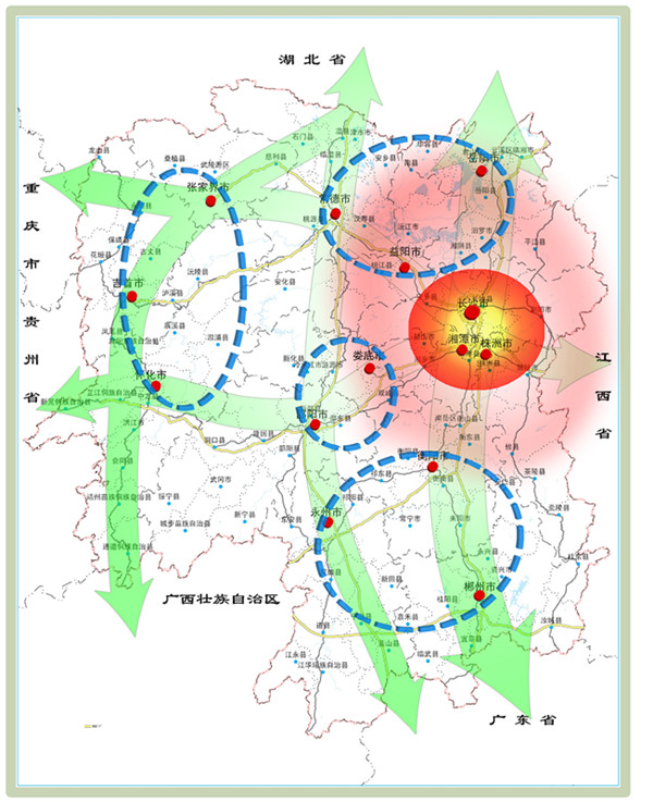 一是构建“一核五轴四组团”为主体的城市化战略格局。构建这一格局,就是在培育壮大长株潭城市群这一战略核心的基础上,积极推进环长株潭城市群建设,以京港澳、长益常张、潭娄邵怀、常娄邵永、张吉怀等五条交通走廊为轴线,以洞庭湖经济区、大湘南、大湘西、湘中四大城市组团为重点,着力构建大中城市和小城镇协调发展的城市化战略格局,实现中心带动,轴线辐射,集聚发展。