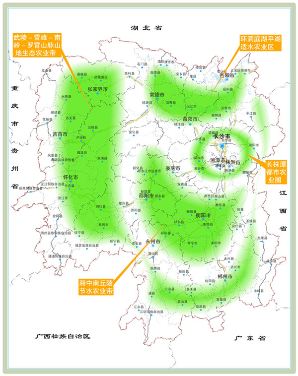 二是构建“一圈一区两带”为主体的农业战略格局。以基本农田为基础,以发展大宗优质农产品为重点,着力构建以长株潭都市农业圈,环洞庭湖平湖农业区,娄邵衡永丘岗农业带和武陵、雪峰、南岭、罗霄山脉山地农业带为主体的农业战略格局。这一格局是结合我省农业自然资源的特点和基础提出来的,着力保障全省耕地数量、质量和农产品供给安全。