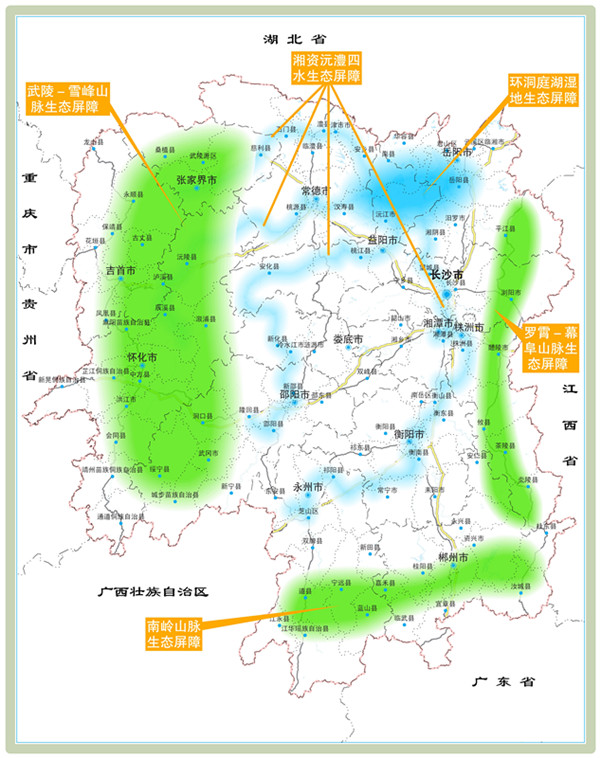 三是构建“一湖三山四水”为主体的生态安全战略格局。即构建以洞庭湖为中心,以湘资沅澧为脉络,以武陵—雪峰、南岭、罗霄—幕阜山脉为自然屏障的生态安全战略格局。这一战略把生态文明建设作为国土空间开发的重要战略任务和发展内涵,充分体现了尊重自然、顺应自然的开发理念,对于在现代化建设中保持必要的“净土”,实现可持续发展具有十分重要的战略意义。